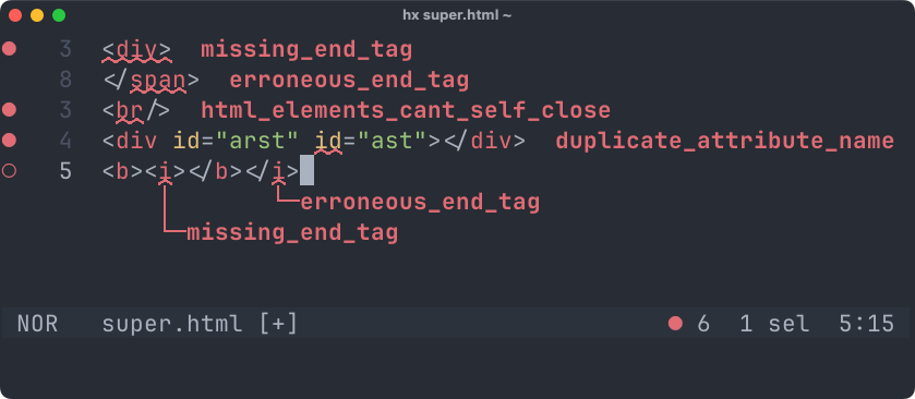 SuperHTML has both dedicated grammars for syntax highlighting and a language server for receiving immediate feedback on syntax errors.